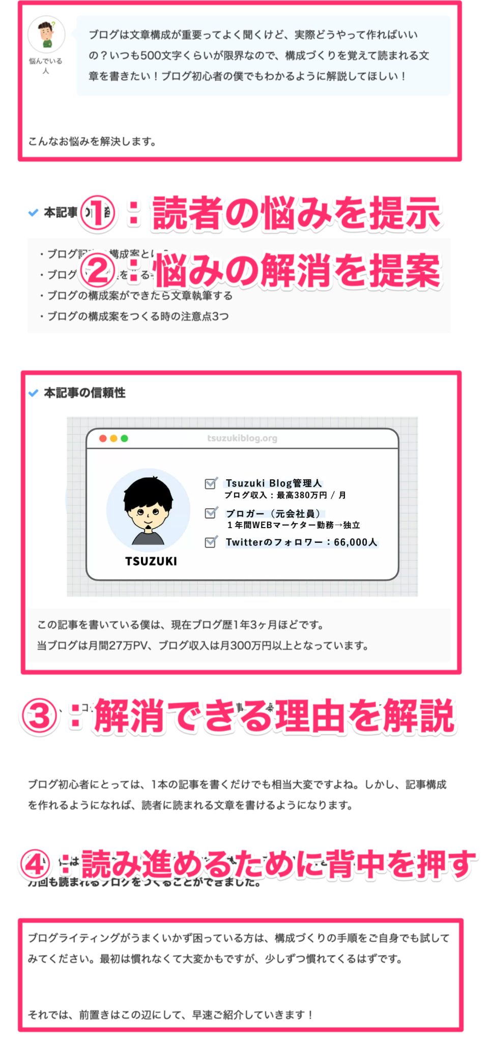 本記事では上記のように設定しています。想定読者を決めるコツとしては、自分がリアルにイメージできる人を選ぶことですね。