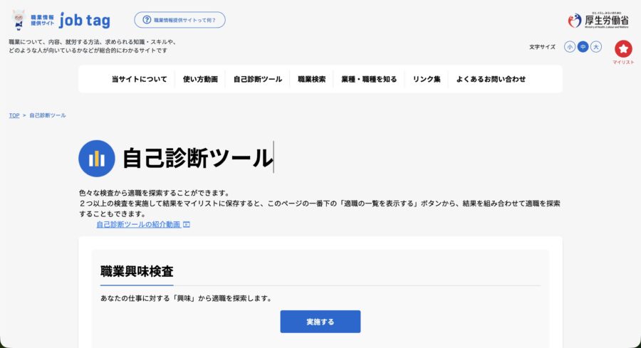 国の膨大な職業データに基づいており、その中にいくつかの簡易診断ツールが用意されています。