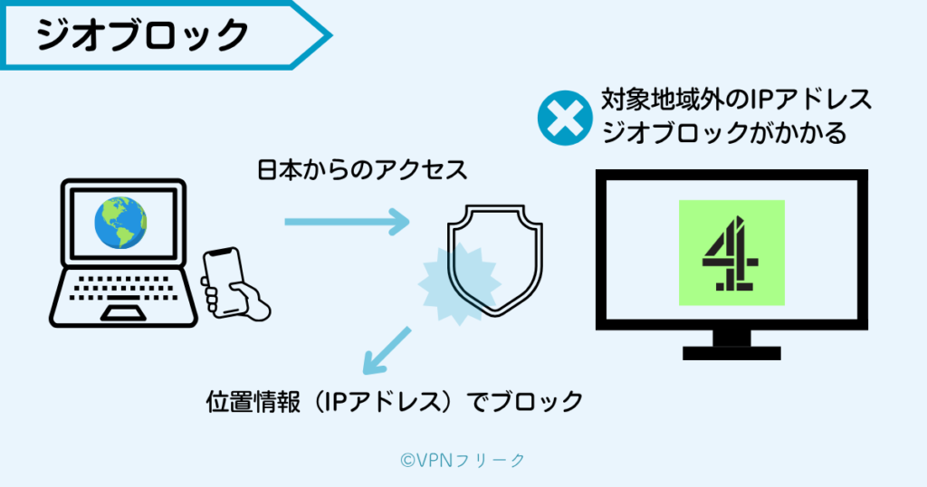 ジオブロック(地域制限)とは、インターネット上の住所であるIPアドレスを識別して、特定の国や地域からのアクセスを制限する仕組みです。