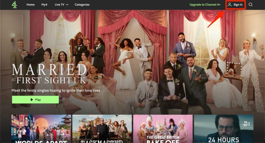 VPNでイギリスサーバーに接続した状態のまま、Channel 4の公式サイトにアクセスします。