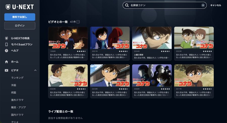ログイン後、検索バーに「名探偵コナン」と入力して作品を検索します。