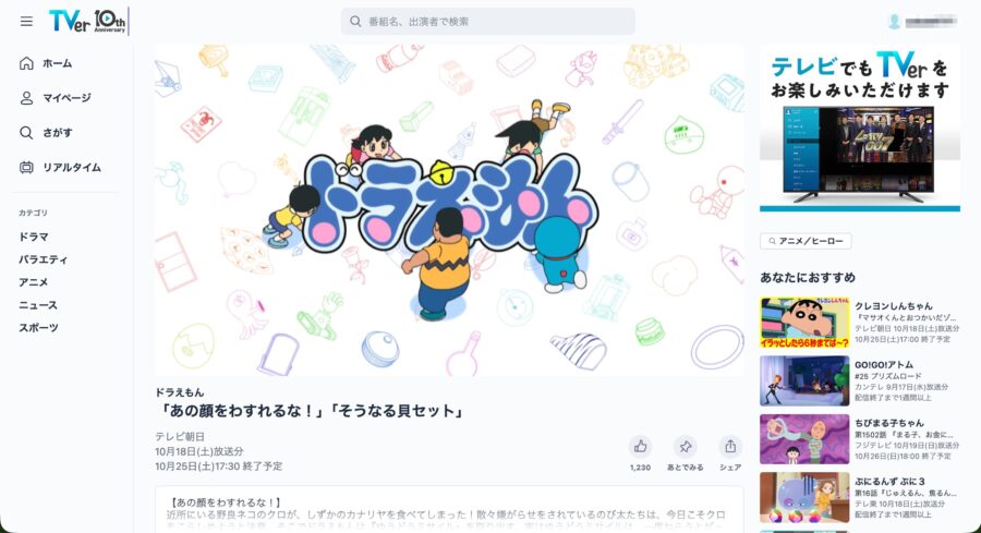 実際、海外からVPNを使って、TVerでドラえもんを視聴できました↓