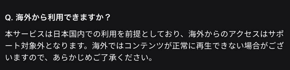 「本サービスは日本国内での利用を前提としており、海外からのアクセスはサポート対象外となります。海外ではコンテンツが正常に再生できない場合がございますので、あらかじめご了承ください。」