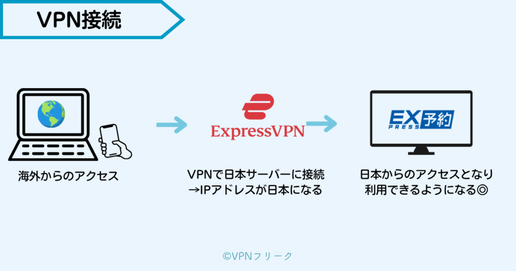 エクスプレス予約のサイト側は、アクセス元が「日本」だと判断するため、ブロックされずに利用可能になります。