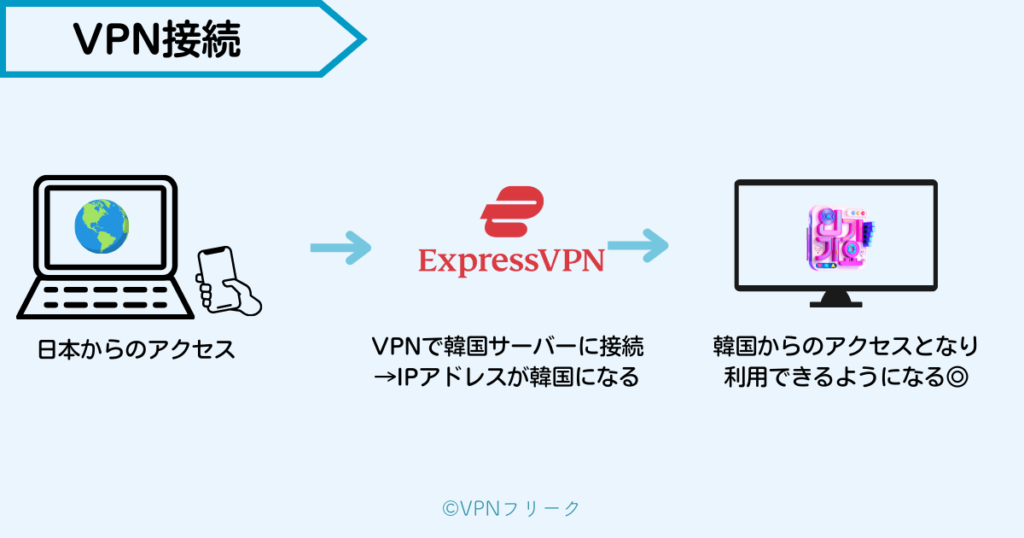 VPNを使うと、インターネット上に専用の通り道を作り、あなたの通信を韓国のサーバー経由にすることができます。