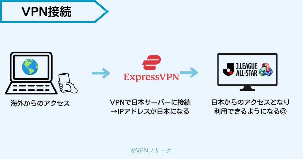 VPNを利用すれば、インターネット上の住所であるIPアドレスを日本に変更できるため、海外からでもJリーグオールスターDAZNカップを視聴可能です。