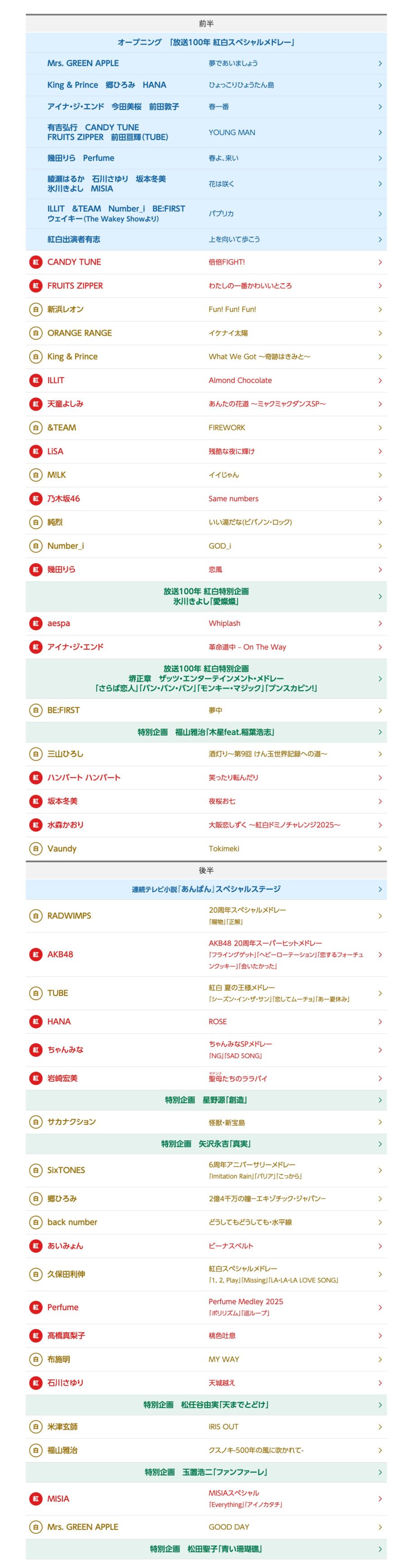 第76回NHK紅白歌合戦の出場歌手・曲順