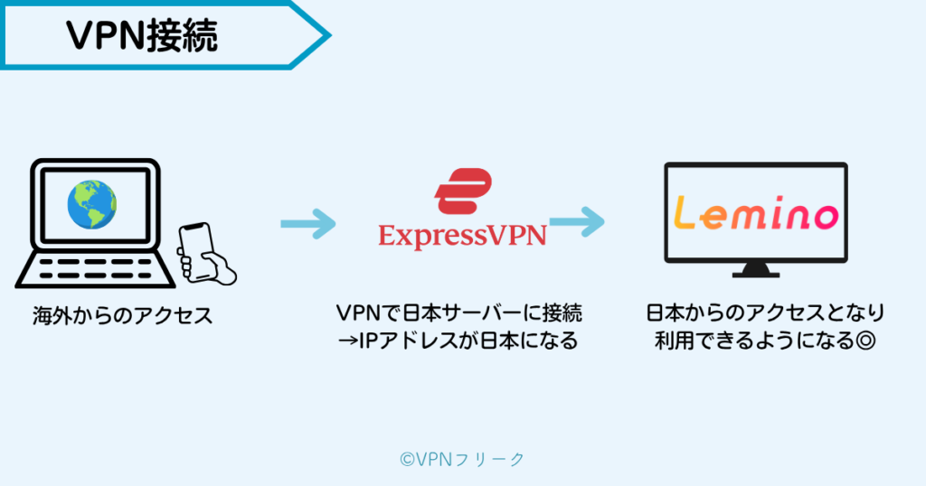 Leminoを海外から視聴する方法は、VPNというサービスを使ってIPアドレスを日本に変更するやり方です。