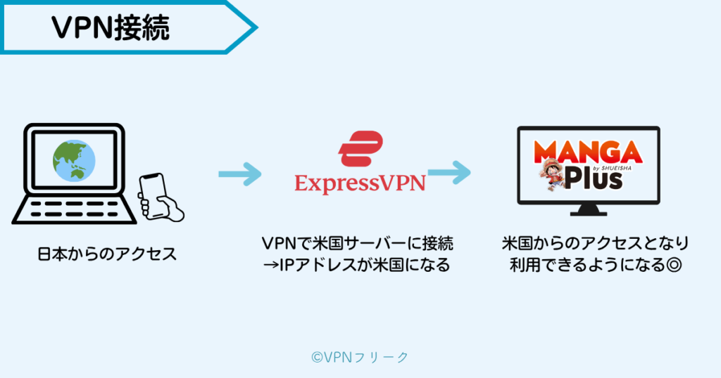 MANGA Plusは地域制限のため通常は日本から見られませんが、VPNを使えば誰でも簡単にこの制限を回避できます。