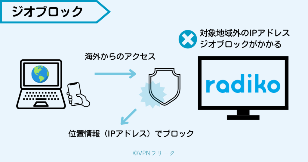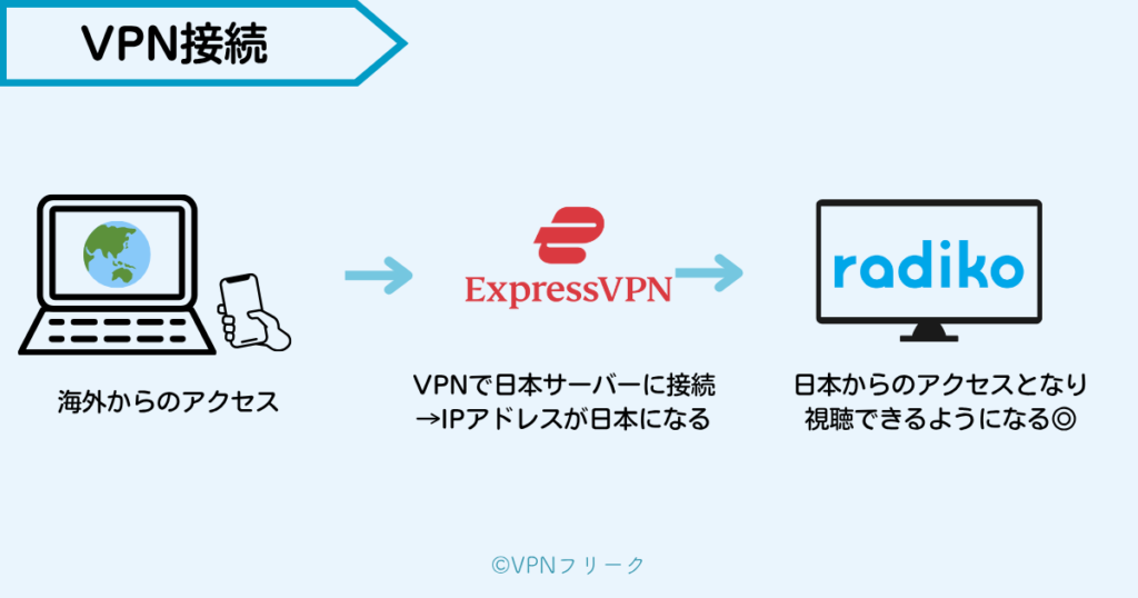 radikoのシステムからは、あたかも日本国内からアクセスしているように見えるため、地域制限によるブロックを回避して、番組を聴けるようになるのです。