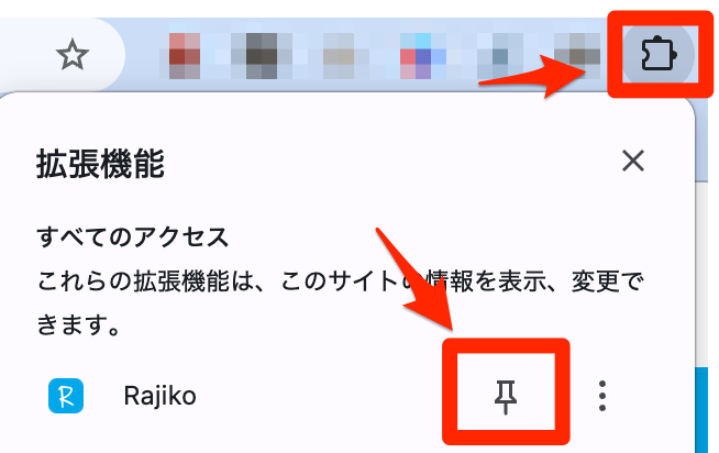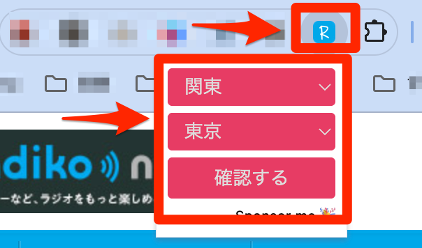 ブラウザのツールバーにあるrajikoのアイコンをクリックすると、地域を選択できるようになります。