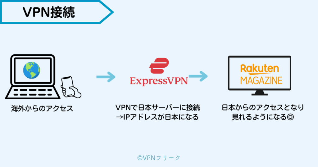 VPNで日本のサーバーに接続すると、日本のIPアドレスが割り当てられるので、楽天マガジン側からは「日本からのアクセス」として認識されるのです。