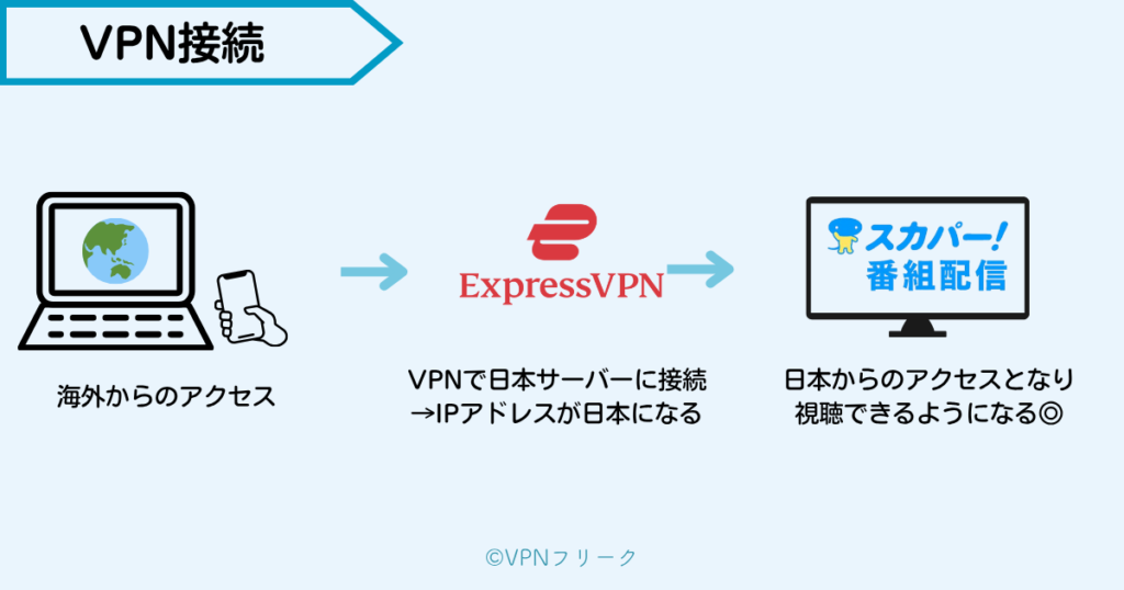 - 具体的な手順:「VPNを契約」→「日本のサーバーに接続」→「スカパー!にアクセス」の3ステップ