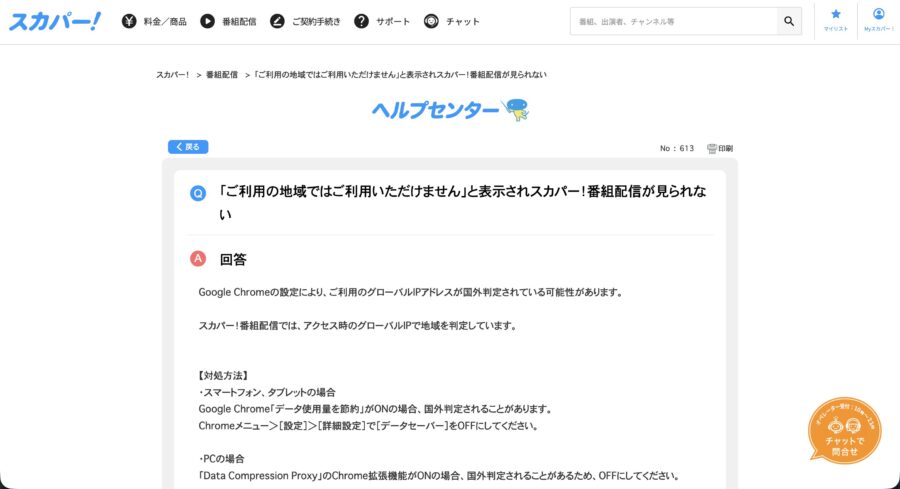 海外からスカパー!にアクセスするとエラー画面が表示されて、見たい番組が視聴できない状態になります。