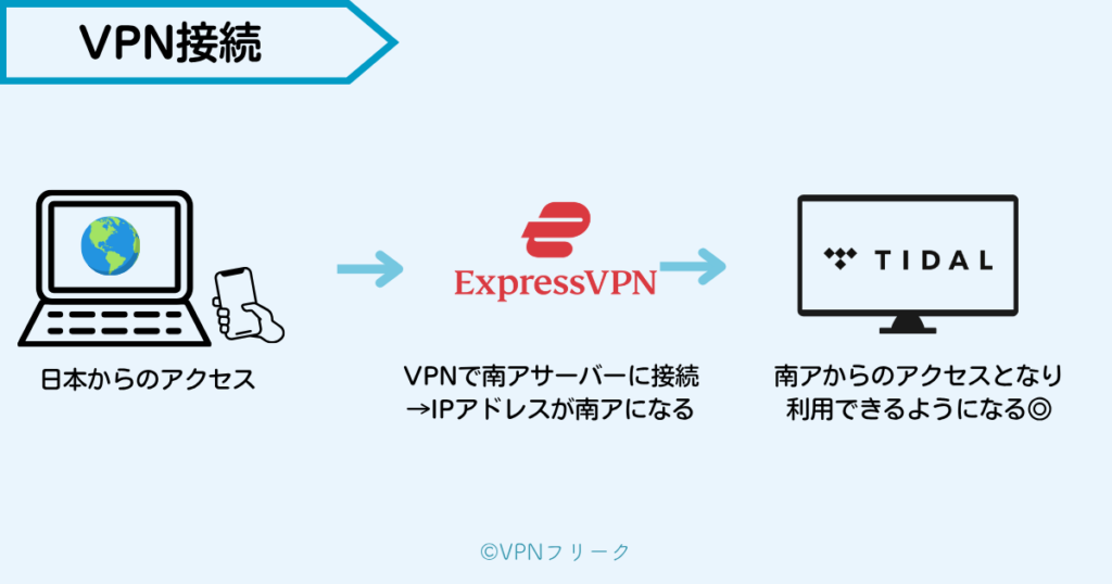 たとえば、南アフリカ共和国のサーバーに接続すれば、Tidalから見て「南アフリカ共和国からアクセスしている」と判断されます。
