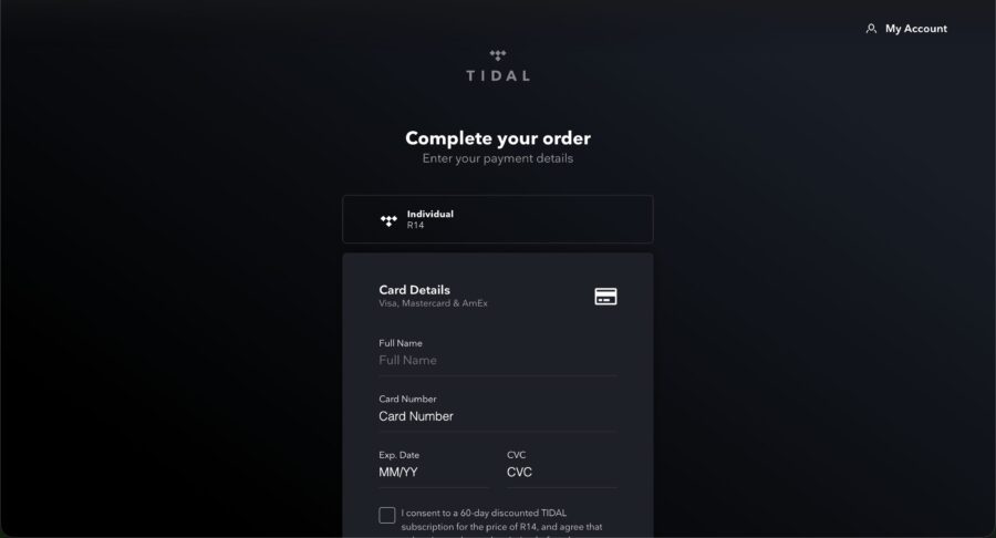 南アフリカ共和国はTidal対応地域のため、アカウント登録画面で国を選択でき、正常に登録できます。